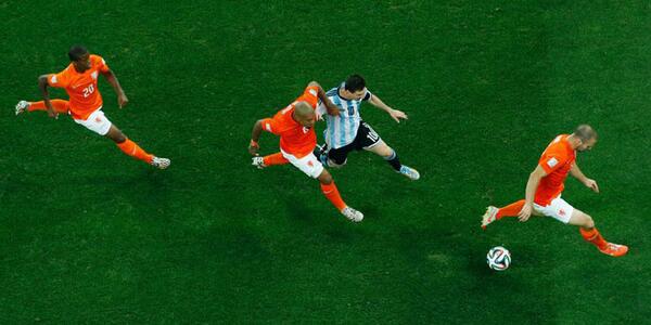 From the outset the Dutch plan was clear. Nigel de Jong was to man-mark Messi throughout. When de Jong was unable to get close, Wesley Sneijder would be there. Behind them was Aston Villa’s Ron Vlaar, the man of the match by some margin after a heroic defensive display for the Dutch. Louis van Gaal’s goal was simple: Do no let Messi beat us. With Angel di Maria unavailable, that difficult mission became easier. Messi’s safety valve couldn’t be found.