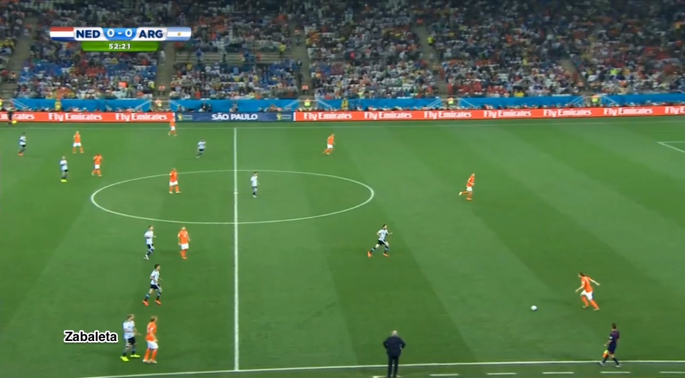 So why was Argentina vs. Netherlands so boring? Well, many reasons, not least the absence of Di Maria. But it’s clear here that Argentina would not risk pressing Holland higher up the pitch, and so Zabaleta generally stayed behind the halfway line.