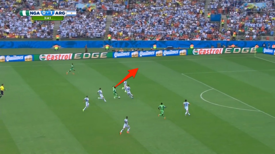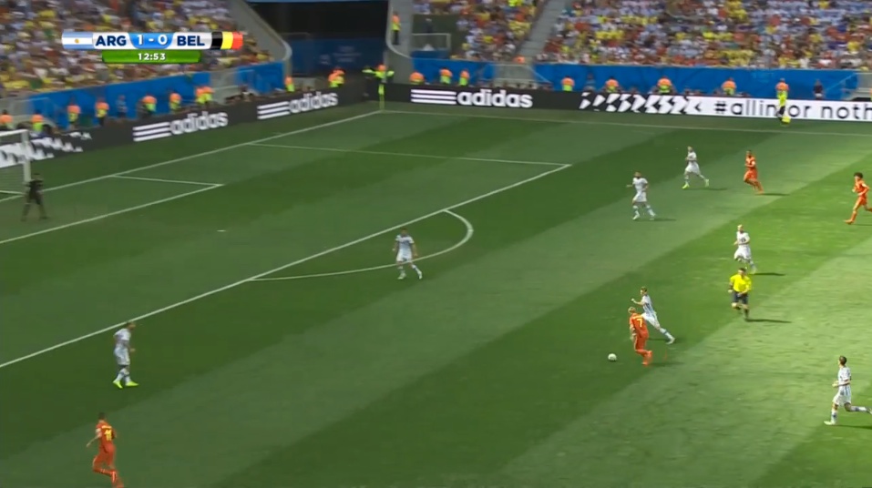 Now we can compare this to the Belgium game, and it’s apparent from the get-go that Pablo Zabaleta is playing further back. The Belgium counter led by Kevin De Bruyne here, for example, runs up against a good Argentine line, with the Man City right back ready in front of Kevin Mirallas: