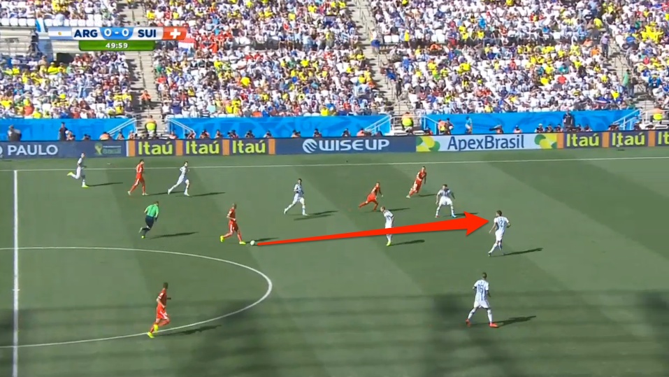 Though Argentina didn’t concede against Switzerland, this may have been more a case of poor finishing from Ottmar Hitzfeld’s side than any defensive prowess (though the same could be said for Argentina). Here, for example, is Argentina’s backline shortly after the second half, which allowed Gökhan Inler to play a through-ball for Xherdan Shaqiri, who set up a chance for Josip Drmic, who shot over the bar.