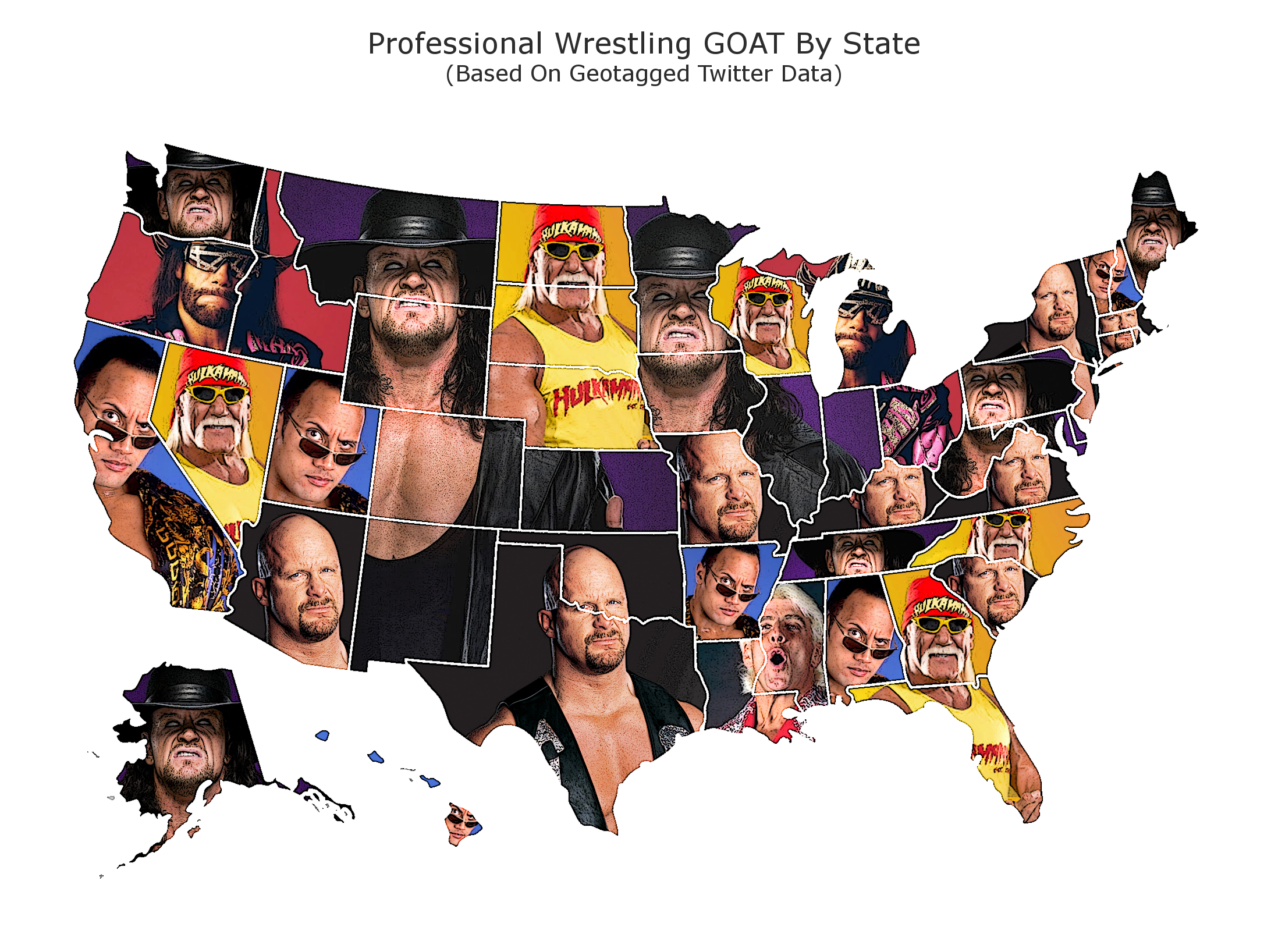 A map created by Sportsinsider.com using geotagged Twitter data gathered from over 190,000 tweets in the last two weeks shows the majority of users in 17 states consider The Undertaker to be the GOAT of professional wrestling. "Stone Cold" Steve Austin was the second-most popular pick, followed by Hulk Hogan.