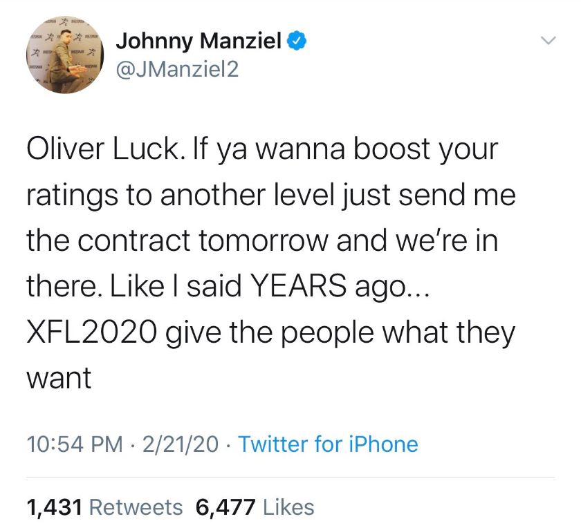 Two weeks after tweeting he had no interest in "playing for another league that's going to fold on you midway through the season," Manziel reached out to the commissioner of the XFL for a job opportunity.